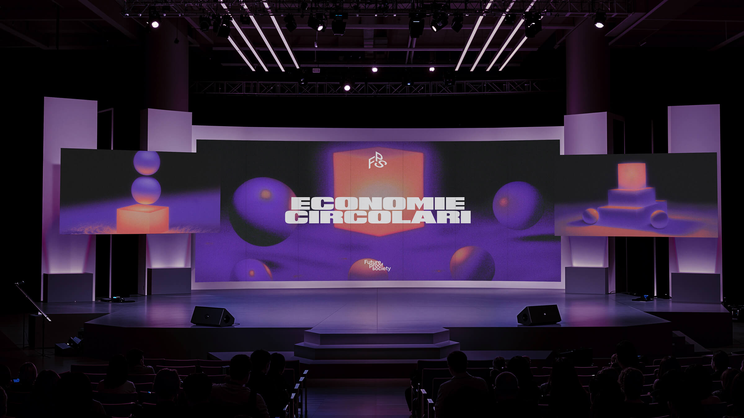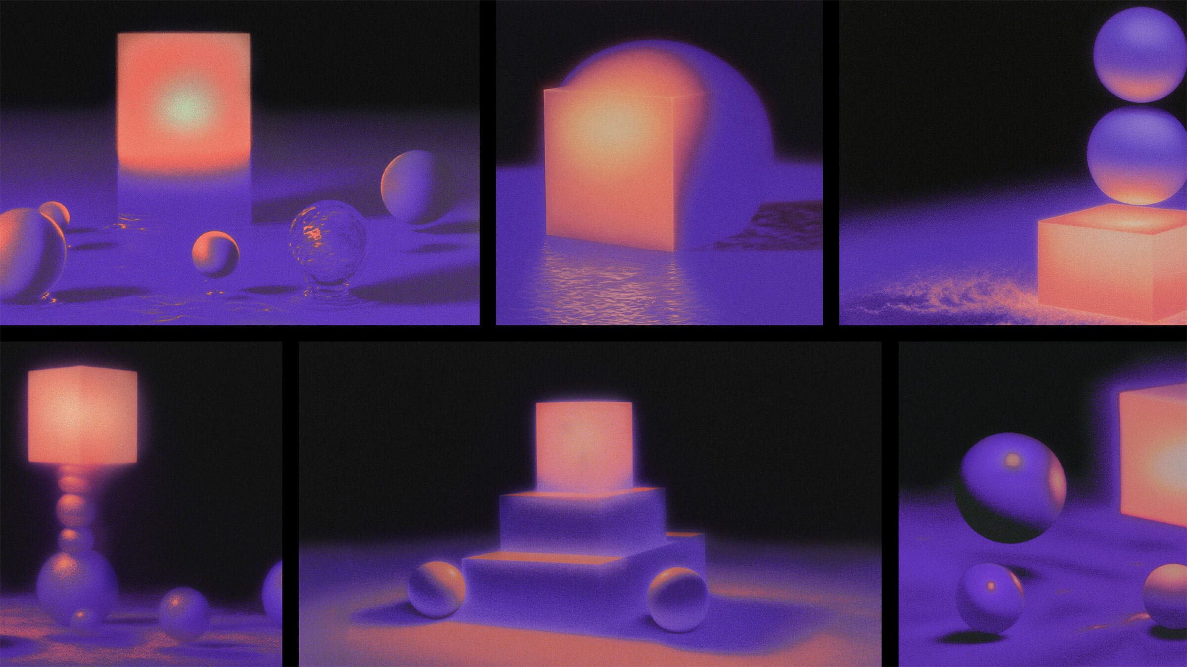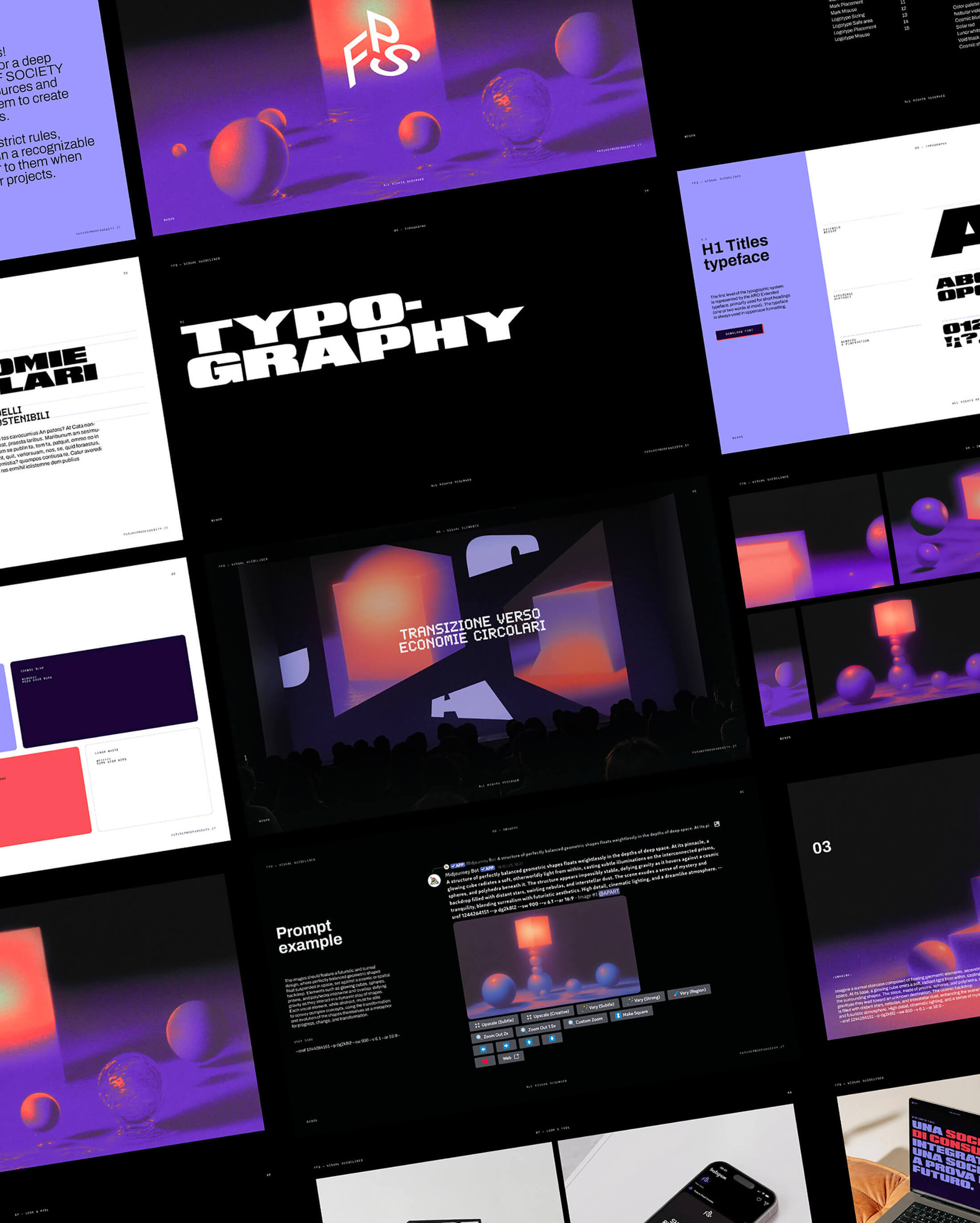 Reflecting this multidimensional approach, FPS’s visual identity celebrates the concept of space, bringing AI-driven, retro-futuristic visuals and perfect geometry to life. Glowing cubes, spheres, prisms, and polyhedra drift and morph against dark, infinite backdrops, evoking the boundless possibilities of outer space. This sense of depth permeates the entire visual system, symbolizing continuous, multifaceted transformation and the harmonious blend of imagination and impact at the heart of FPS’s mission.