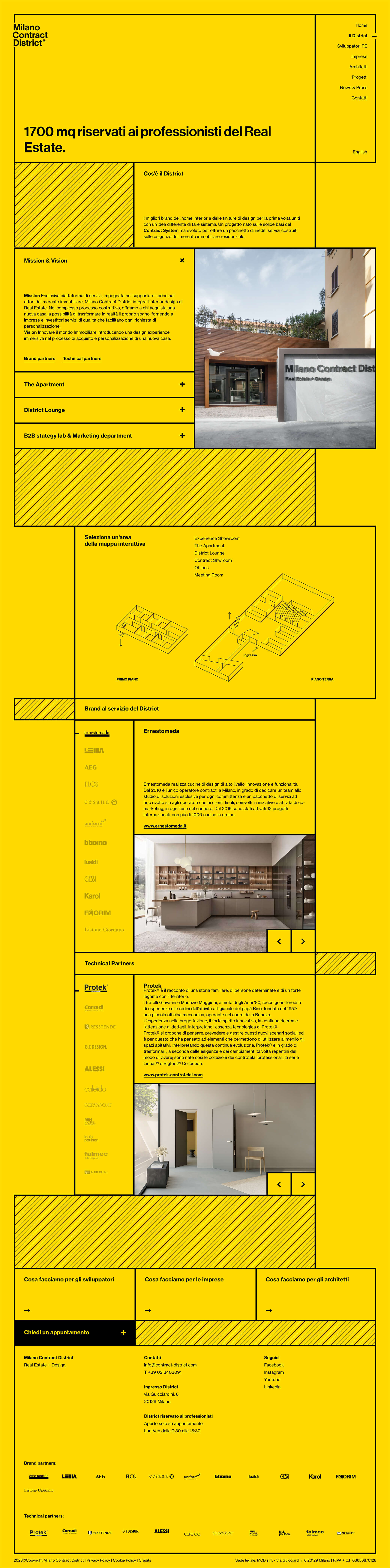 Milano Contract District’s visual identity stands out with its vibrant yellow color scheme and bold, precise typography. The graphic system, featuring endless outlines of property floor plans, mirrors the brand’s ethos and its founders’ vision. This design approach, combined with the exceptional product quality offered by its partners, underscores the brand’s unique role in adding value at every stage of real estate development. The website is distinguished by its innovative and user-friendly layout, effectively meeting the needs of clients seeking quick and clear information while accommodating the company’s diverse communication requirements.